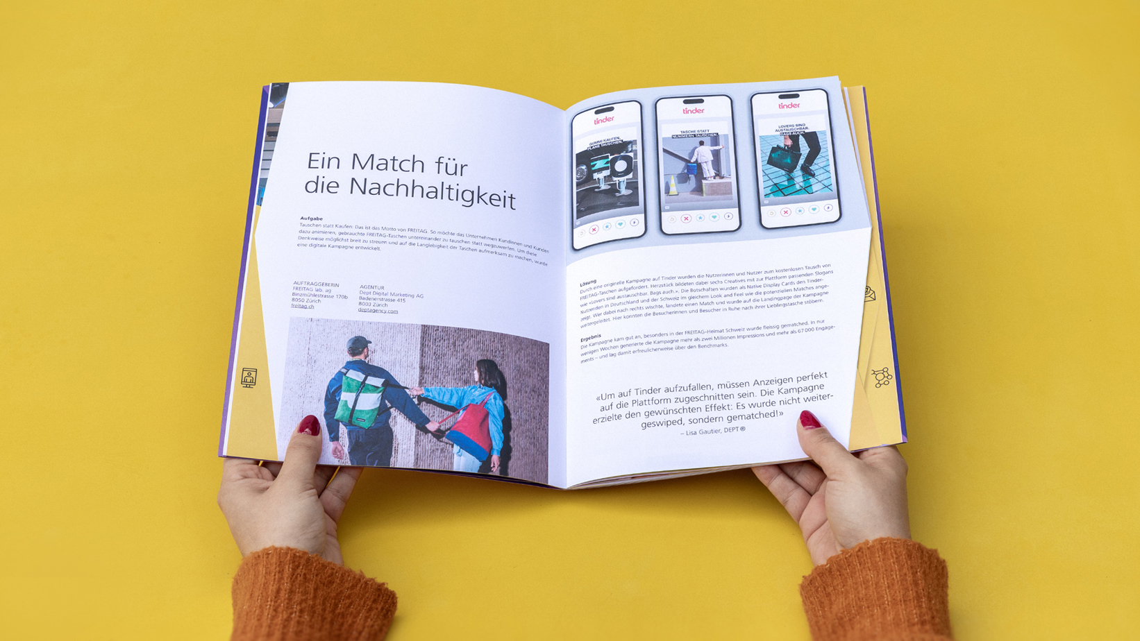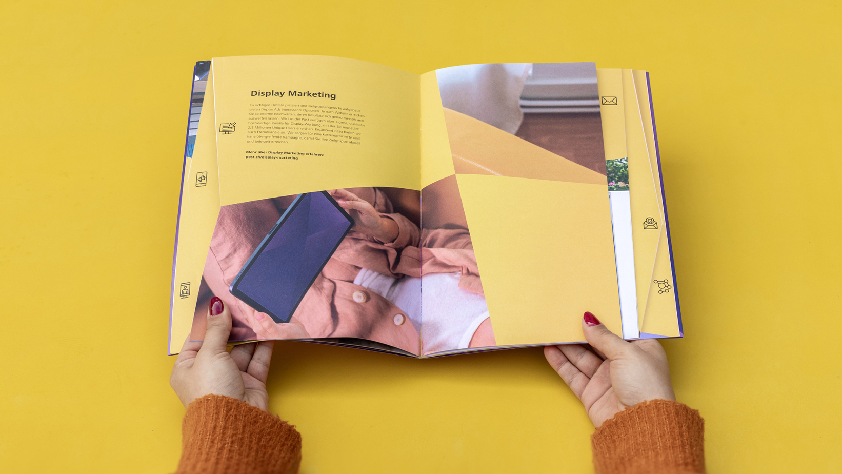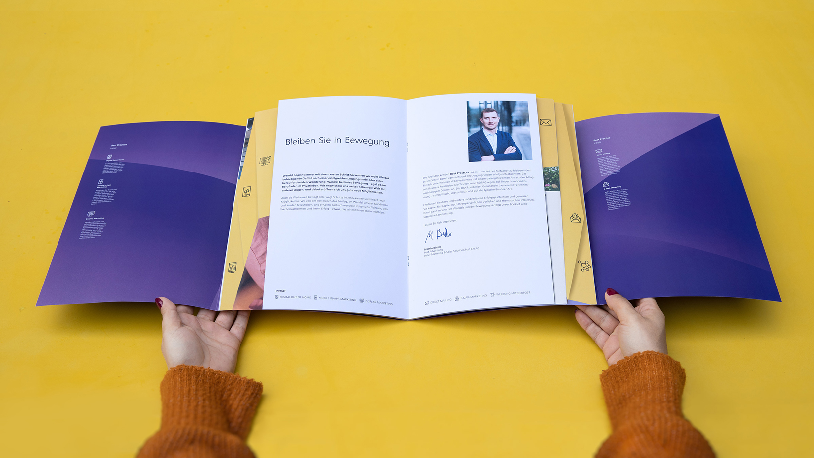 Das Booklet porträtiert aktuelle Best Practices aus den Bereichen Mobile In-App Marketing, Digital Out of Home, Display Marketing, Direct Mailing und E-Mail-Marketing. Eine Sammlung, die dazu ermutigt, konventionelle Werbeansätze hinter sich zu lassen. Beim Layout sind wir deshalb bewusst keiner Leserichtung gefolgt, sondern führen den Lesenden direkt zu den für ihn relevanten Erfolgsgeschichten. Übersichtlich nach Themen sortiert, enttäuscht es auch beim klassischen Durchblättern nicht. «Best Practice» bringt visuell auf den Punkt, was es inhaltlich liefert – ein starkes Statement für Werbung mit Post Advertising.