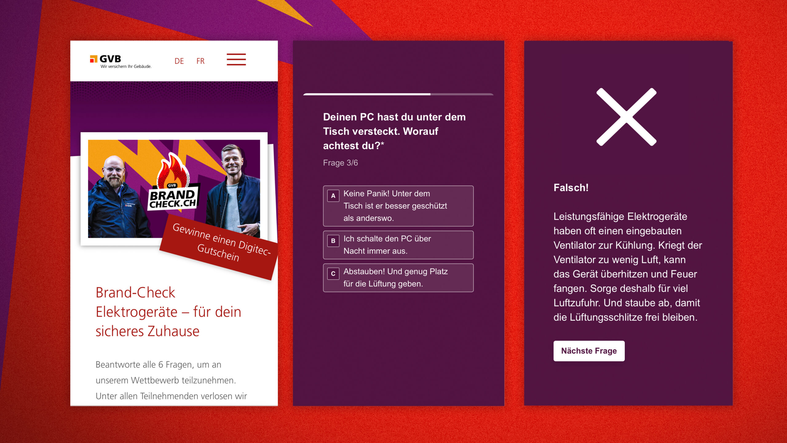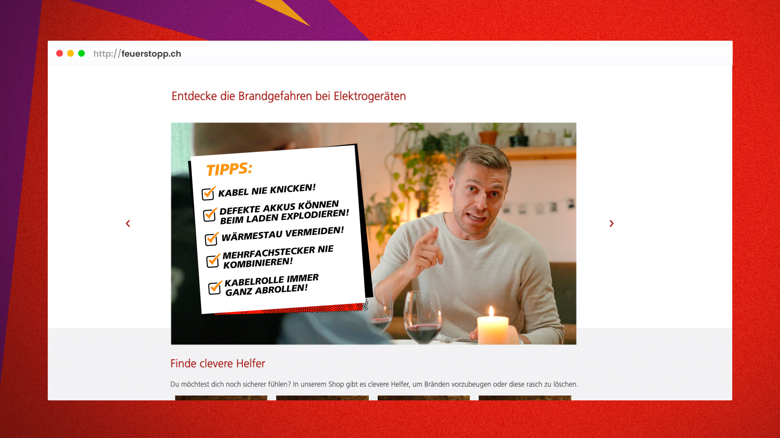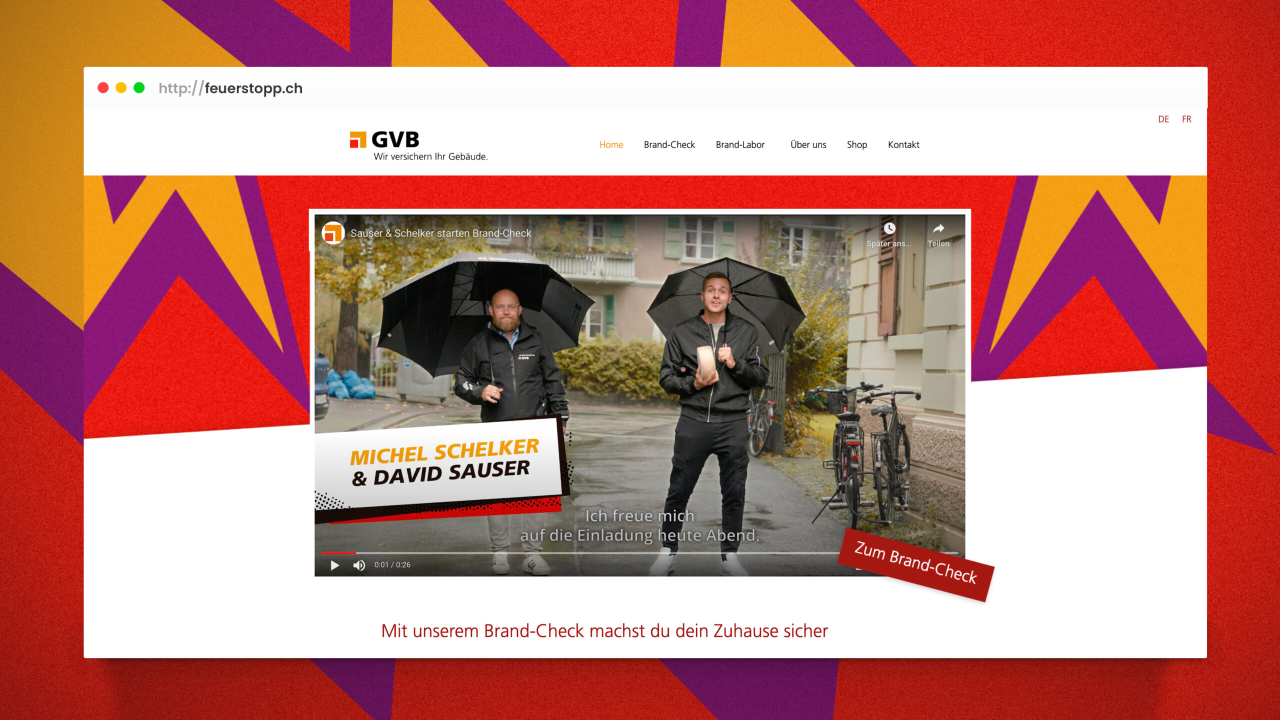 Auf brandcheck.ch ergänzen wir die bestehende Kommunikation von feuerstopp.ch mit Videos und einem interaktiven Brand-Check. Das macht Brandprävention auch für eine junge Zielgruppe zugänglich. Um das neue Duo Sauser und Schelker zu etablieren, haben wir mit der GVB eine Multi-Channel, crossmediale Kampagne konzipiert und umgesetzt.
