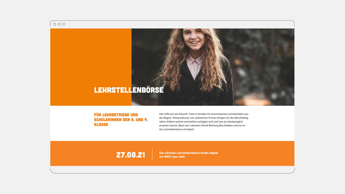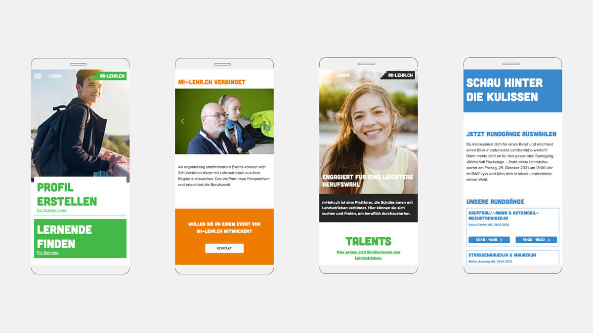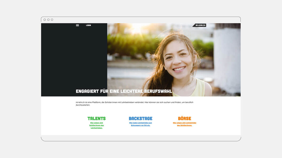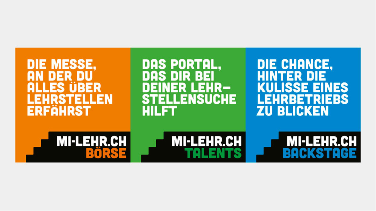 mi-lehr.ch bietet Schulabgänger:innen wie Unternehmen gleichermassen neue Kontaktmöglichkeiten: An der BÖRSE – eine Messe für Lehrstellensuchende – präsentieren über 60 Lehrbetriebe ihr Unternehmen. Auf TALENTS hinterlegen Lehrstellensuchende für interessierte Lehrbetriebe ihr Profil. Und BACKSTAGE bietet Rundgänge an, bei welchen Jugendliche unverbindlich hinter die Kulissen von engagierten Lehrbetrieben blicken zu können.