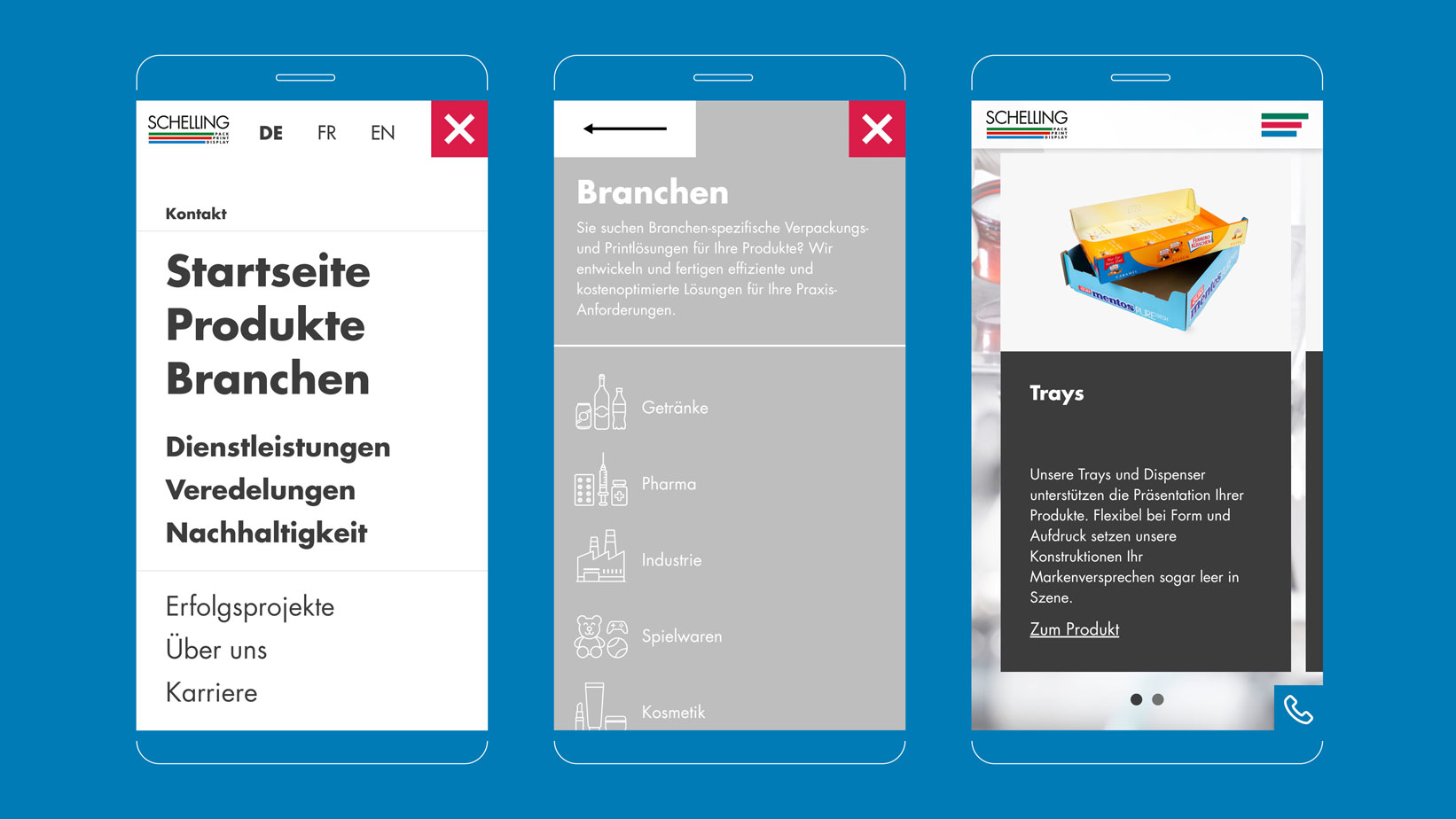 Wir alle haben fast täglich mit Produkten der SCHELLING AG zu tun. Das Schweizer Familienunternehmen fertigt Verpackungen, Displays und Druckerzeugnisse für alles Mögliche. Von der Bieretikette, über die Sushi-Schachtel bis zum Papp-Cologna. Um das vielfältige Angebot teils revolutionärer Erfindungen über acht Branchen schnell und einfach im Web zu zelebrieren, haben wir die perfekt passende Website entwickelt und gestaltet.